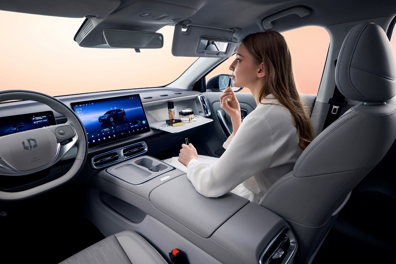 零跑B01沿用了B系列首創(chuàng)的"百變副駕空間"設(shè)計(jì)——通過6個魔術(shù)拓展孔與1個矩形凹槽,可自由組合折疊桌板、手機(jī)支架、儲物盒、水杯架、掛飾等配件,適配辦公、娛樂、收納等多場景需求。